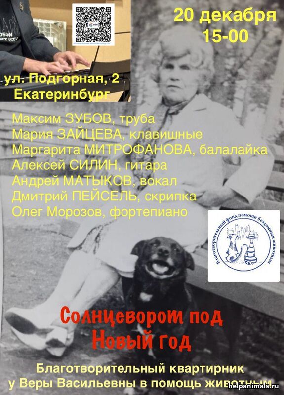 Дорогие друзья!Приглашаем на квартирник! Профессиональные музыканты - в помощь животным! Прекрасное новогоднее настроение! Чай! Вход- Ваше пожертвование в помощь бездомным животным. Подгорная, 2 Первый этаж.